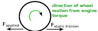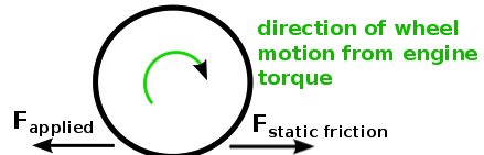 A wheel rolling forwards experiences a static friction force in the same direction of motion, which counters the force driving the base of the wheel backwards, such that static contact is maintained. A slippery surface means that the applied force might exceed the maximum static friction force and the wheel will start to ‘spin’.