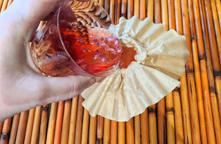 When you come back you should see that the water is tinted the color of your natural materials. Now you need to sift out the particles so it’s all liquid. Use a coffee filter stretched over your final ink container to catch the solids.