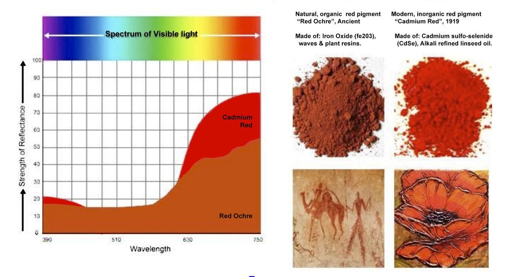 See the two different paints in Photo 4. One is a natural paint and one is a synthetic (manmade) paint. You can see on the graph of light that they reflect different color combinations. Modern paints are reflected in a very narrow space in the spectrum. Cadmium Red is only really reflected in the red spectrum and very highly. Natural paints are reflected across the entire spectrum with a concentration in one area Red Ochre is reflected in all colors, more so in red spectrum but not significantly more than other colors. More red, and only red is reflected back to our eyes by the modern paint. That’s why it looks more like a true red. Red, but also a lot of other colors as well are reflected back to our eyes by the natural paint. That’s why it looks like a dull or brown-ish red.