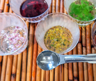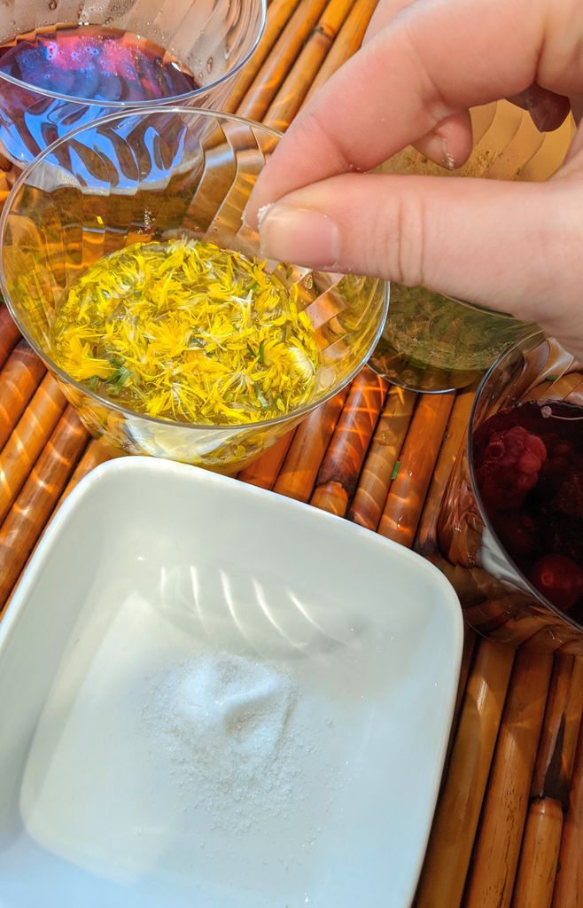 You’ll need hot water, almost boiling, to add to your natural materials. Our natural materials measured to about 1 TBS each. We added in 1/4 cup of water- you can add more depending on how much natural materials you have. After you do that you need to add the vinegar (1/2 tsp per ¼ cup of water) & salt (1 pinch per container). Vinegar has been used in inks for quite a while. It’s what’s called a “mordant” or “fixative”. It helps the dye “bind”, “set”, or attach onto paper of fabric. The salt will help preserve the ink so that it lasts longer. Now let it sit overnight.