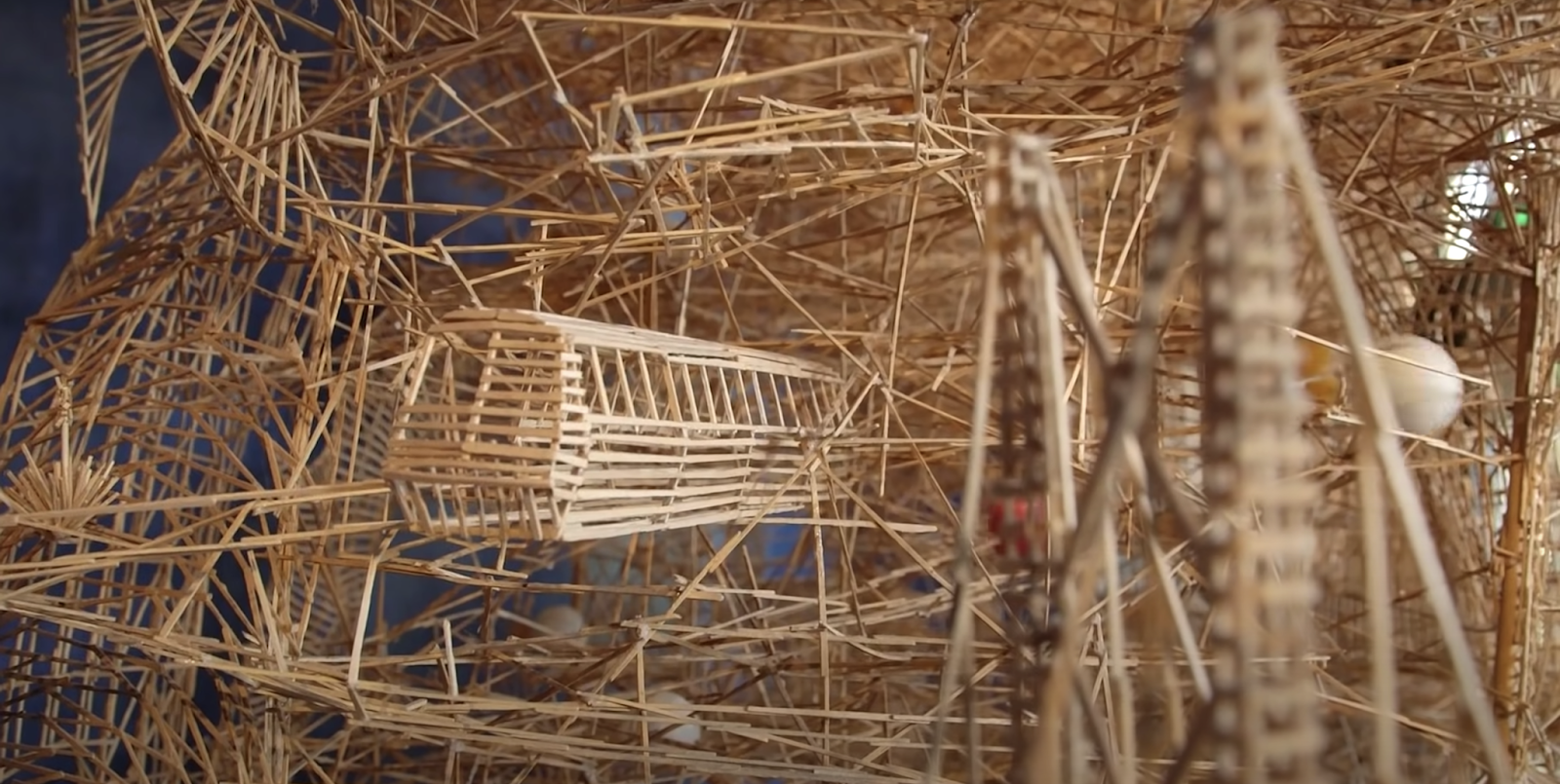 This nine foot tall wooden sculpture of San Francisco was made with glue and 105,387 and a half toothpicks. It was built by Scott Weaver who, stuck at home at the age of 14 with spinal meningitis, started working in earnest on the project and continued on it for 37 years. It has 10 different starting points and 5 different weaving track ‘tours’ throughout for ping pong balls to roll through, hence its name: Rolling Through the Bay.