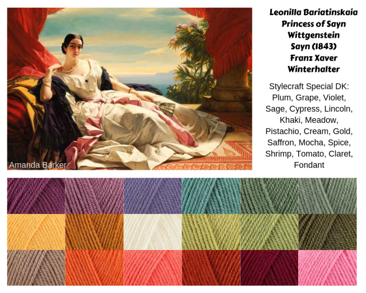 Known for her great beauty and intellect, the princess is resplendent in a luxurious gown of ivory silk moiré with a pink sash around her waist. A deep purple mantle wraps around her back and falls across her smooth arms. Under carefully arched eyebrows, her heavy lidded eyes gaze languidly at the viewer while she artfully toys with the large pearls around her neck. Winterhalter contrasted sumptuous fabrics and vivid colors against creamy flesh to heighten the sensuality of the pose, the model, and the luxuriant setting.