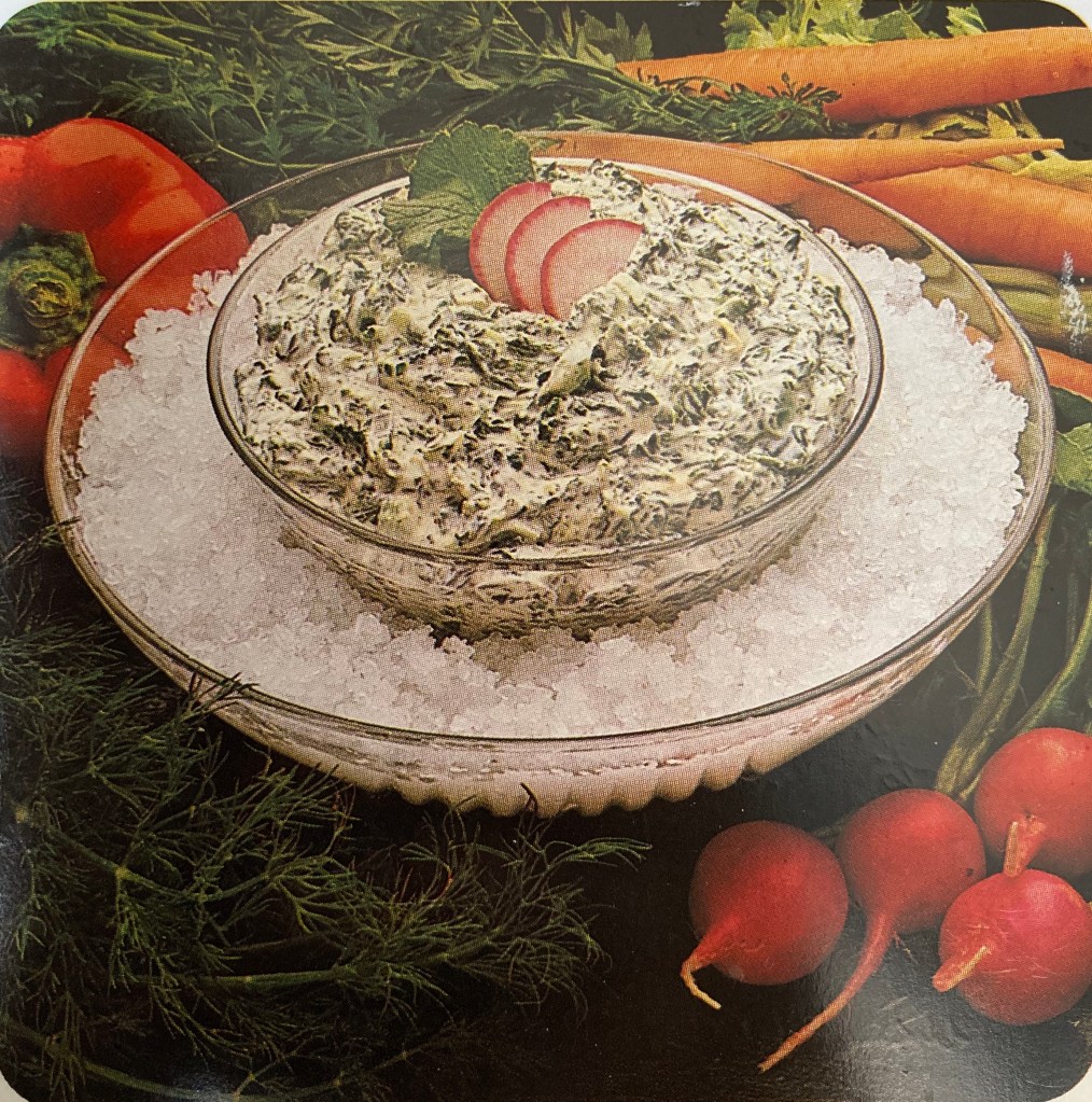 Update your appetizer specialties with this sour cream-spinach dip which is a surprising mélange of good things: dry leek soup mix, parsley, onions, and green pepper. It benefits from touches of dill, salad seasoning, and garlic. For dippers, use chips or slice fresh vegetables.