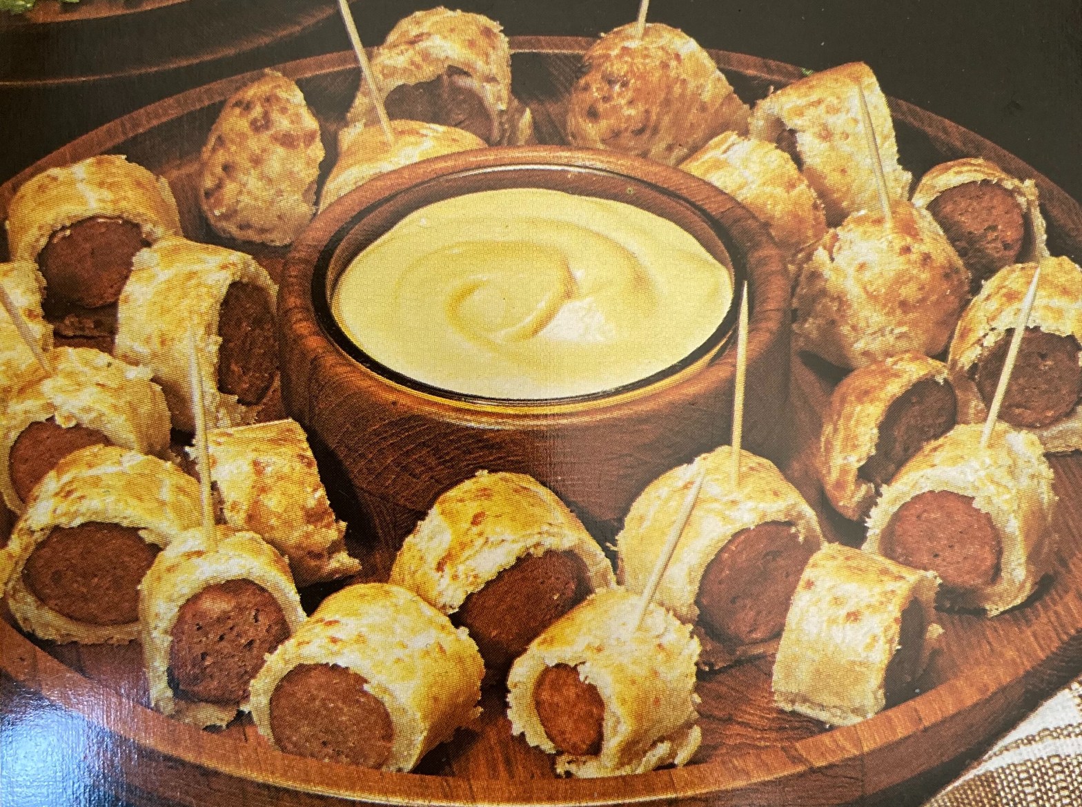 Spicy Polish sausages or Bratwurst are wrapped in a simple-to-prepare flaky pastry that is made with cottage cheese. After baking, you slice each bundle into 1-inch pieces; serve speared with a cocktail pick.