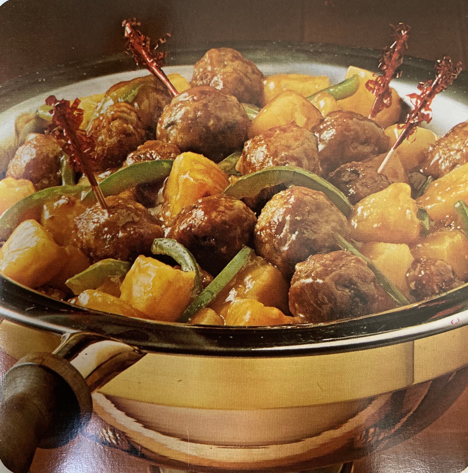 Chopped water chestnuts, mixed with ground pork, give these meatballs crunch. You serve them in a sweet-sour sauce with chunk pineapple and green peppers. Keep them hot in a chafing dish; spear them with wooden picks.
