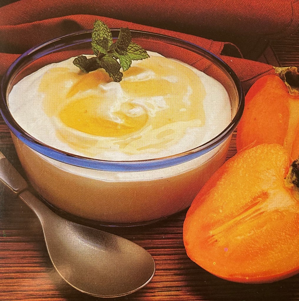 The persimmons recommended in this recipe were likely the new astringent types, and the recipe aims to balance the almost too-sweet flavor with the tang of the sour cream.